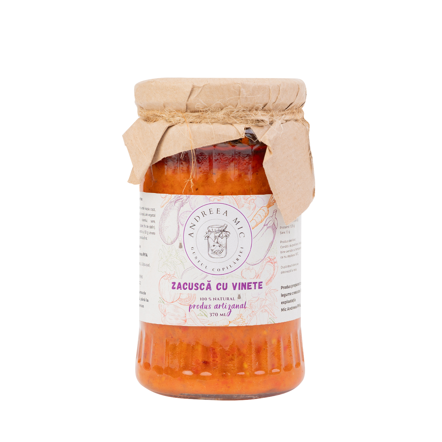 Într-o lume grăbită, Zacusca de Vinete Andreea Mic – Gustul Copilăriei îți readuce în farfurie simplitatea și bucuria meselor de altădată. Este un produs artizanal autentic, pregătit cu răbdare și pricepere, exact așa cum găteau bunicile în copilăriile noastre, cu ingrediente curate și naturale.
